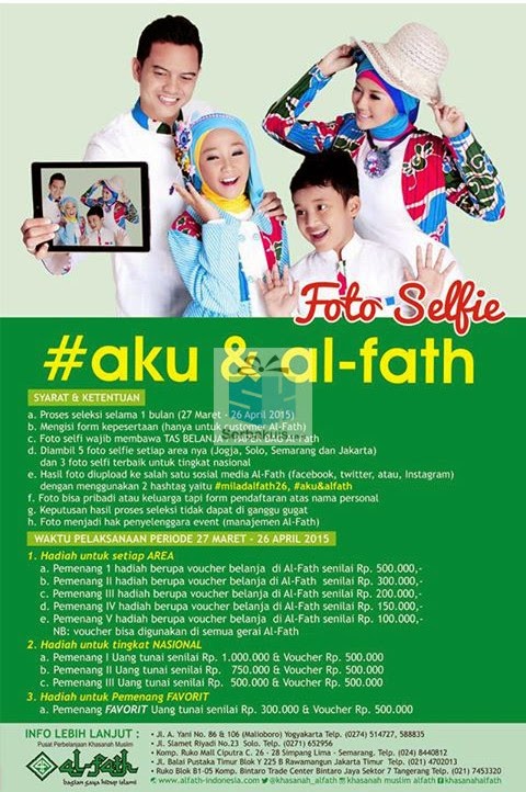 Kontes Aku & Al-fath Berhadiah Uang Tunai Jutaan Rupiah – Ingin berbelanja busana muslim terbaru? Langsung aja datang ke Al-Fath sob. Khasanah Muslim Al Fath adalah pusat perbelanjaan yang selalu menghadirkan busana muslim dengan berbagai model terbaru setiap bulannya. Kalo kamu bosan dengan model busana muslim yang itu-itu saja, segera kunjungi Al Fath, karena disana kamu bisa memilih berbagai busana muslim dengan model yang unik dan pastinya up to date. Tak hanya busana muslim untuk orang dewasa saja, tapi juga anak-anak. Pusat perbelanjaan Khasanah Muslim Al Fath saat ini berada di 4 lokasi, yaitu di Jakarta, Yogyakarta, Solo, dan Semarang.