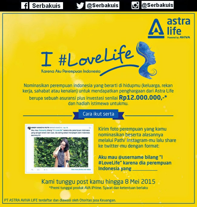 Kali ini Astra Life sedang mengadakan kontes foto “I#LoveLife” dengan hadiah asuransi plus investasi senilai puluhan juta rupiah. Caranya gampang sekali, tinggal upload foto perempuan yang berarti dalam hidup kamu. Boleh keluarga, rekan kerja, sahabat maupun kenalan kamu. Kalo mau tau info selengkapnya yuk langsung saja simak yang dibawah ini…