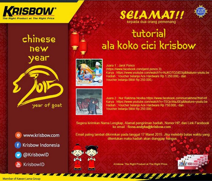 Pemenang Kontes Video Tutorial Ala Koko Cici Krisbow – Di bulan februari ini tidak hanya ada kemeriahan Valentine saja sobat, tetapi ada juga Chinese New Year 2015 alias imlek yang tahun 2015 ini adalah tahun Kambing. Nah, untuk memeriahkannya, kali ini ada brand Krisbow Indonesia yang akan menyelenggarakan kontes video secara online nih, tenang saja berhadiah kok.