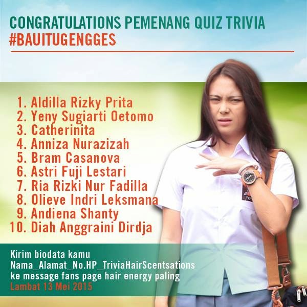 Pemenang Trivia Quiz Bau Itu Gengges – Buat kamu para cewek, dari pada duduk manis main sosial media saja, mendingan sosmednya buat ikutan kuis berhadiah yang diadakan oleh Hair Energy berikut ini deh. Menangin hadiah seru berupa paket produk untuk 10 orang pemenangnya. Kuis akan berlangsung sampai tanggal 26 april. buruan ikutan